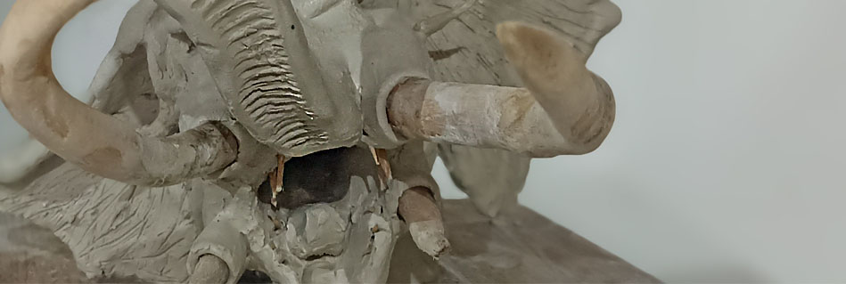 L’opera colpisce per l’originalità dei materiali utilizzati: accanto alla creta, che modella con forza e dettaglio la massa imponente delle creature, sono stati utilizzati legno, ferro, scotch e cartone, scelti per dar forma a elementi che altrimenti sarebbero stati irrealizzabili con la sola creta. Il risultato è una scultura che rompe le barriere dello spazio che è pensata per essere appesa come un trofeo fantastico che trasporta l’osservatore in un mondo lontano, dove mito e arte si incontrano.